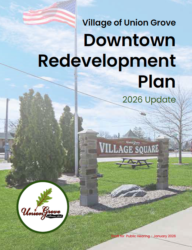 1/9/26 – A draft of the Downtown Redevelopment Plan has been completed and is now available for public review. The Plan Commission will hold a public hearing on the draft plan on Monday, February 2 at 6:00 p.m. at the Union Grove Municipal Center, which will also include a presentation of the plan. The hearing will provide an opportunity for residents and stakeholders to share comments before the plan is finalized. Copies of the draft plan are available for the public to view.
