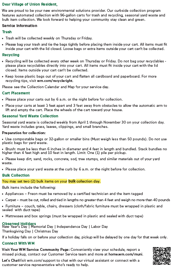 The Village has also updated Waste Management’s informational materials provided to residents to more clearly reflect how bulk collection is scheduled.