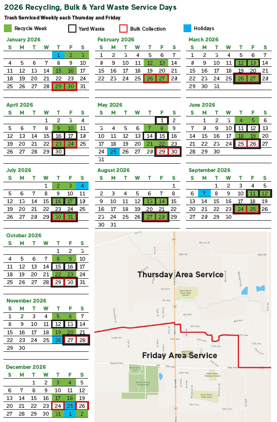 Note: When contacting Waste Management, residents may be asked for an account number. The Village utilizes a municipal account, so residents should let customer service know they are part of the Village of Union Grove program and provide their address instead.